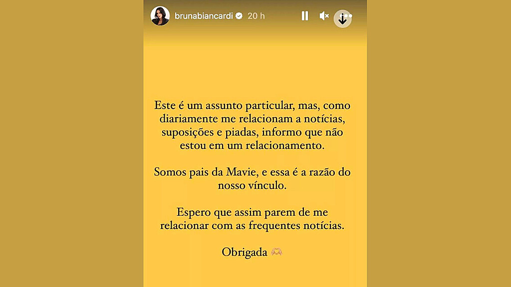 A mediados de octubre nació la hija que tienen entre ambos y, al parecer, la recién nacida es el único vínculo que tendrán ahora. En una historia de esa red social Bruna intentó ser lo más clara y concisa posible sobre el tema.