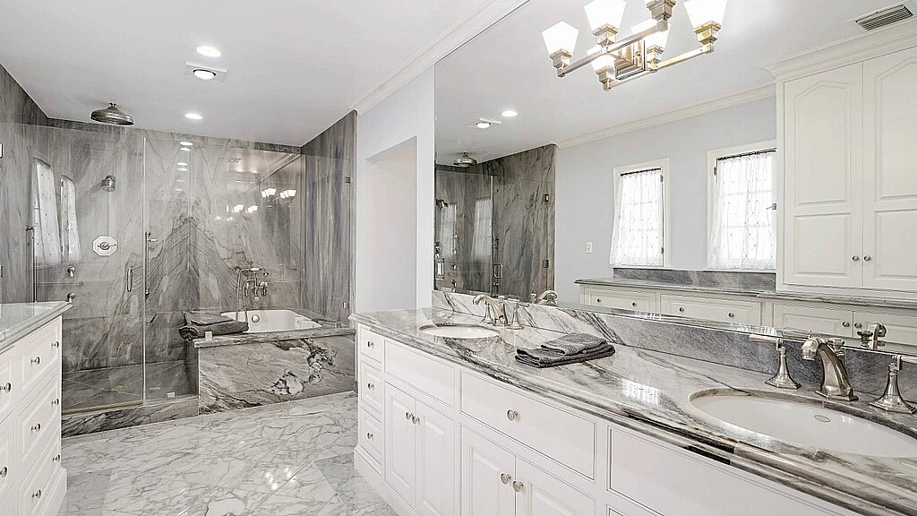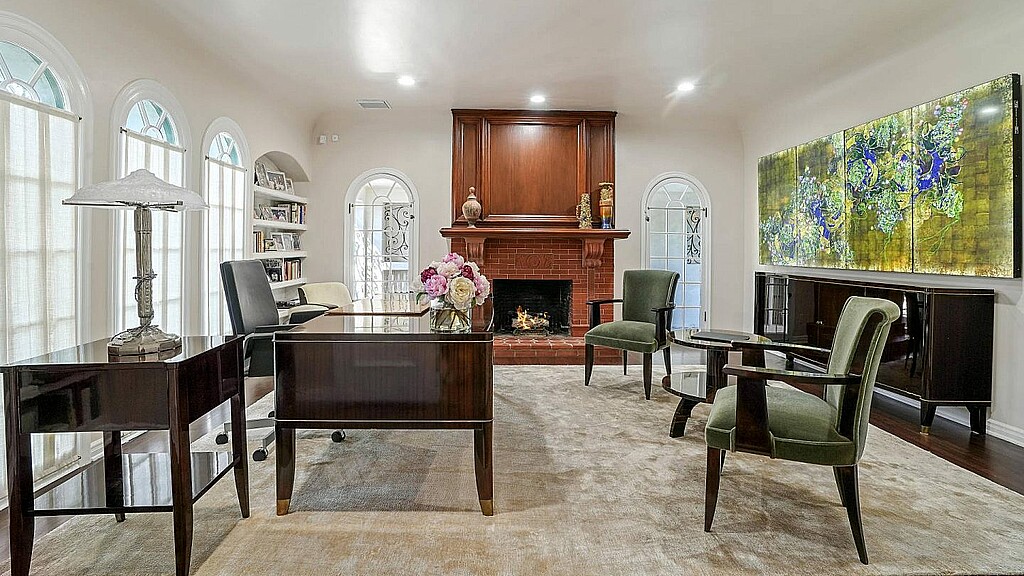 La planta baja incluye una sala de estar con chimenea, una sala familiar con un bar, una cama y un baño para invitados, un suntuoso comedor formal y una oficina, además de una cocina de chef renovada con una isla central, electrodomésticos de acero inoxidable y un desayunador.