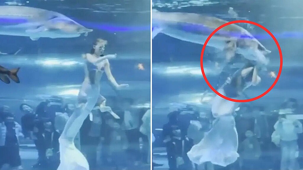 Imágenes dramáticas capturaron el momento en que un pez gigante atacó el rostro de una joven intérprete de sirena, mientras actuaba frente a los niños en un acuario chino.