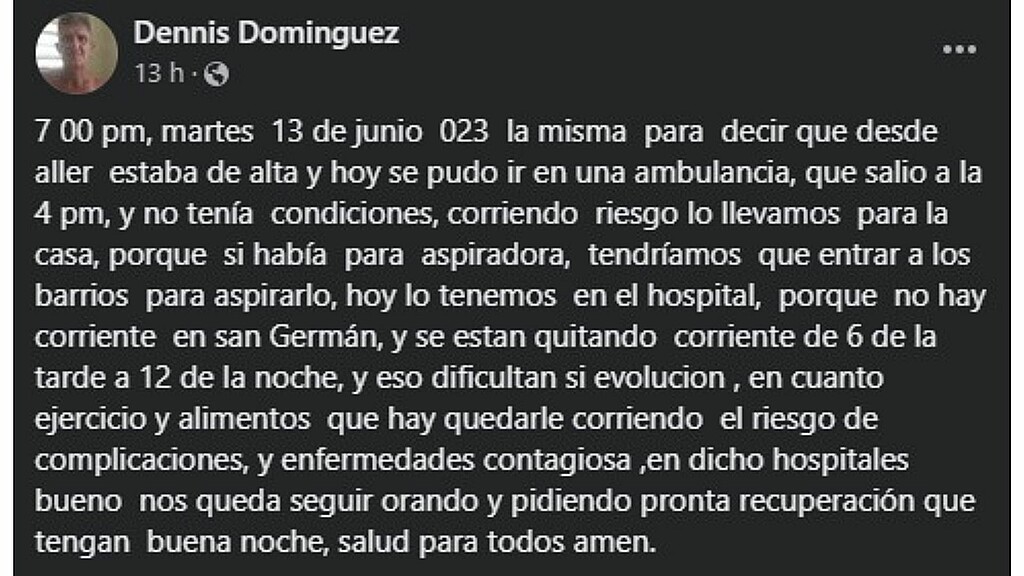 Sobre las 7 de la tarde de este martes 13 de junio Domínguez relató que “lo tenemos en el hospital porque no hay corriente en San Germán, y se está quitando la corriente de 6 de la tarde a 12 de la noche, y eso dificulta su evolución, en cuanto a los ejercicios y alimentos que hay que darle, corriendo el riesgo de complicaciones”.