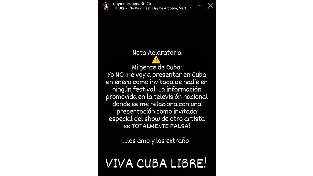 La cantante cubana Dayme Arocena aclaró en sus redes sociales que no se presentará en Cuba el próximo mes de enero, tal y como fue difundido el pasado fin de semana en un programa televisivo del país caribeño. La artista usó una historia de Instagram para desmentir dicha información.