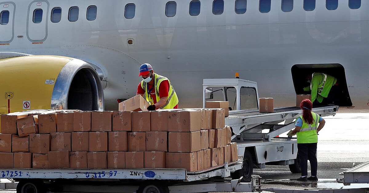 Trabajadores del aeropuerto internacional José Martí de La Habana realizan la descarga de un donativo