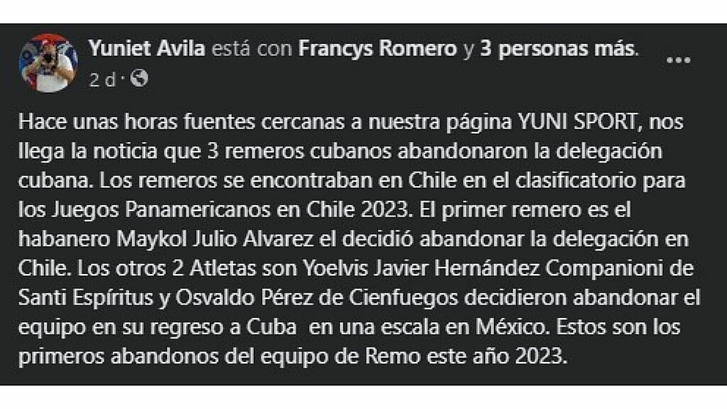 “Hace unas horas fuentes cercanas a nuestra página YUNI SPORT, nos hicieron llegar la noticia de que tres remeros cubanos abandonaron la delegación cubana. Los remeros se encontraban en Chile en el clasificatorio para los Juegos Panamericanos en Chile 2023”, escribió.