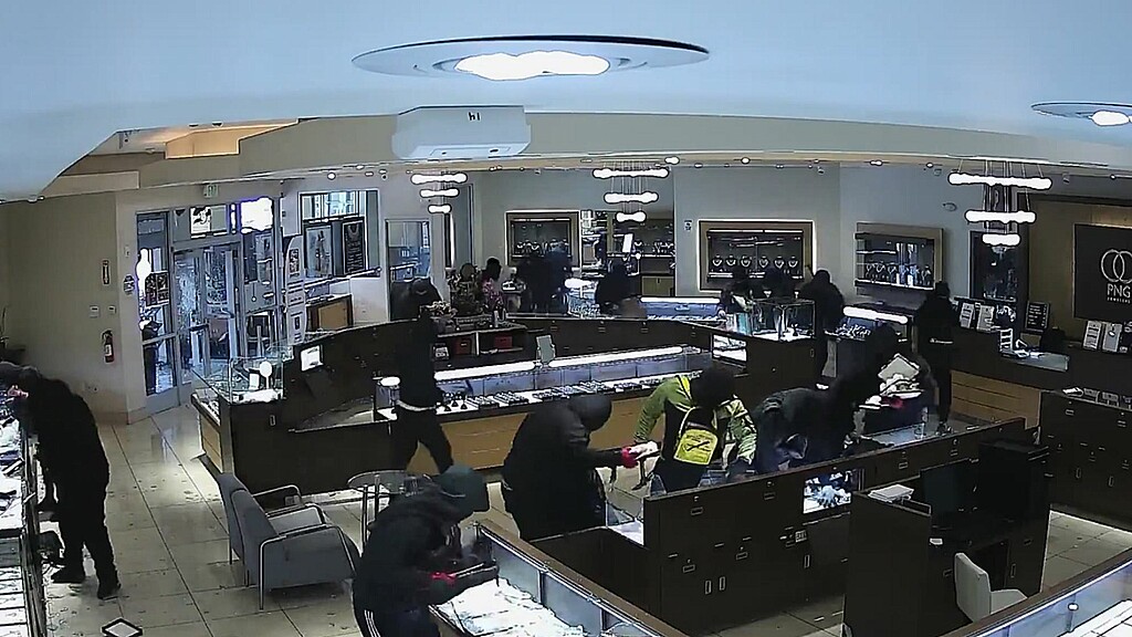 Surveillance cameras captured the exact moment the thieves, using hammers and other tools, forced open the main entrance of PNG Jewelers at 1:27 p.m. With their faces covered by hoods, the assailants quickly dispersed through the store, breaking almost all the display cases and taking as much jewelry as possible before fleeing.