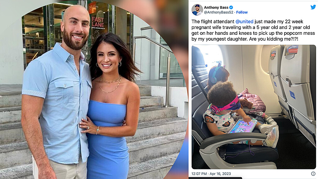 “The flight attendant @united just made my 22-week pregnant wife traveling with a 5-year old and 2-year old get on her hands and knees to pick up the popcorn mess by my youngest daughter,” Bass tweeted. “Are you kidding me?!?!” wrote Bass on Twitter.