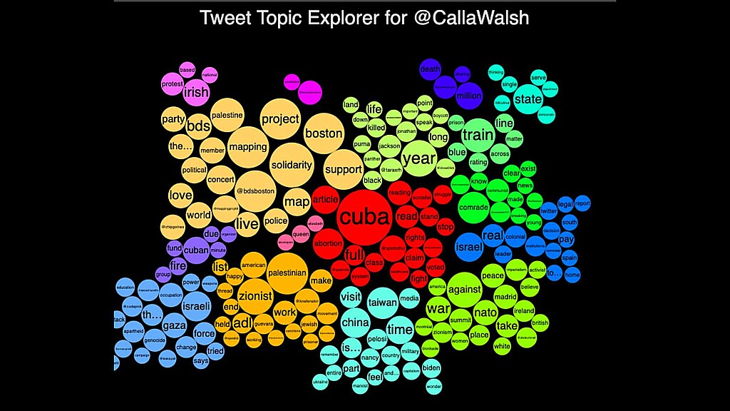 The most frequent word Walsh used was "Cuba" while other leading phrases were "BDS," "Zionist" "NATO" and "war."