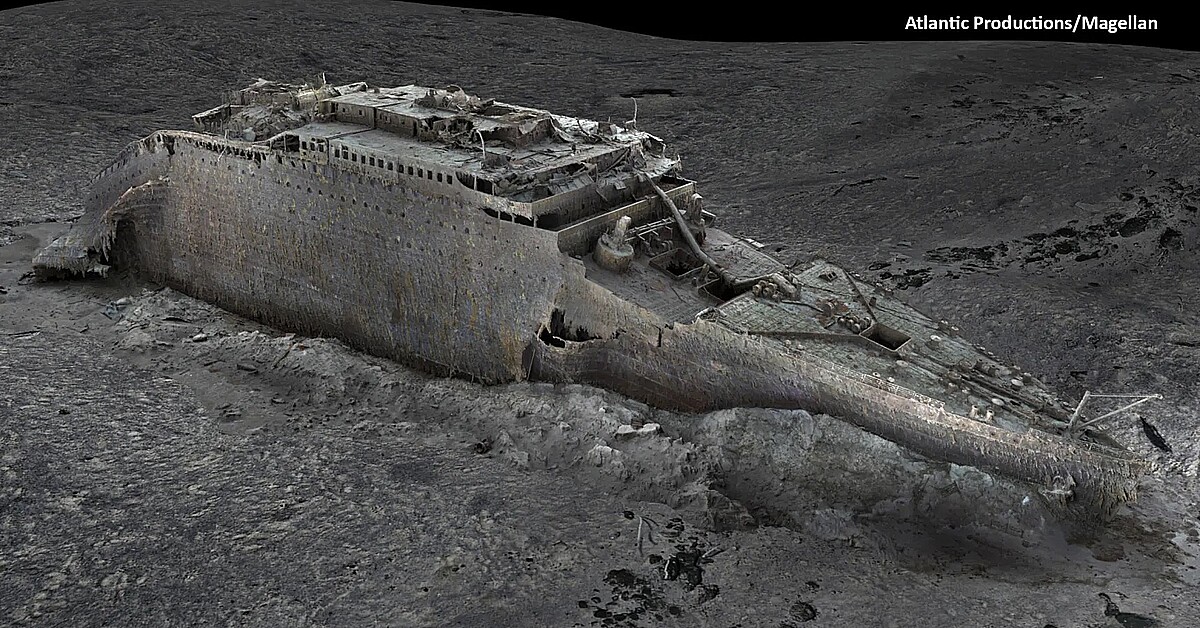 The project provides a 3D “digital twin” of the wreckage that lies 12,500 feet (3,800 meters) on the seabed of the Atlantic. Using deep-sea mapping, the imagining provides a detailed view of the ship as if the water has been drained away.