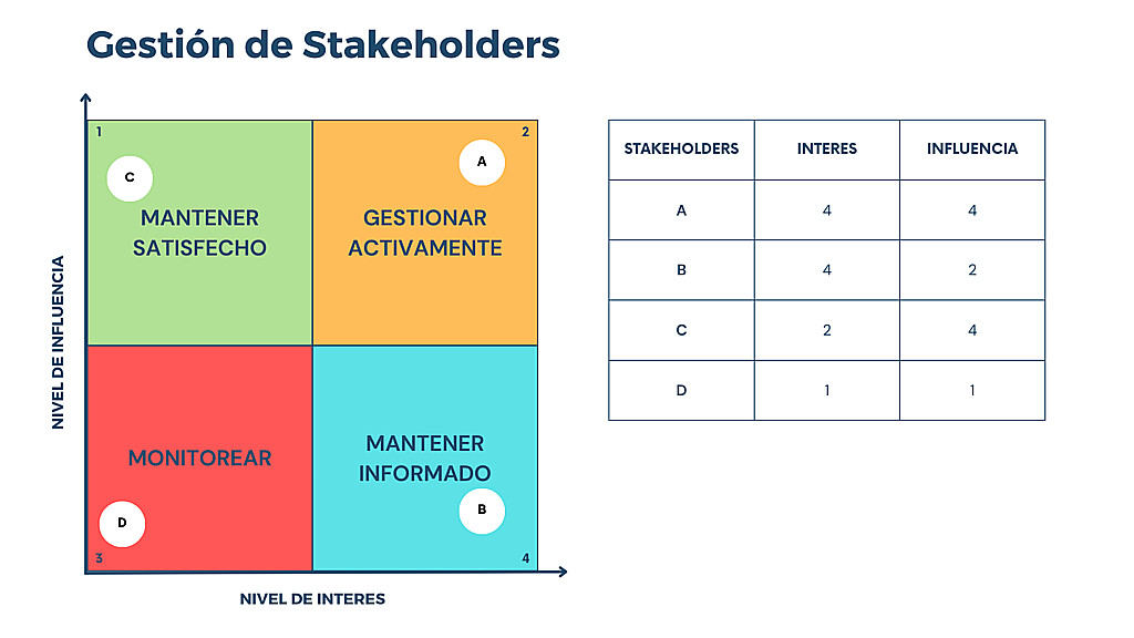 Para gestionar a los stakeholders de manera efectiva, es importante comprender sus niveles de influencia e interés. Los stakeholders pueden clasificarse en cuatro grupos según estos niveles: