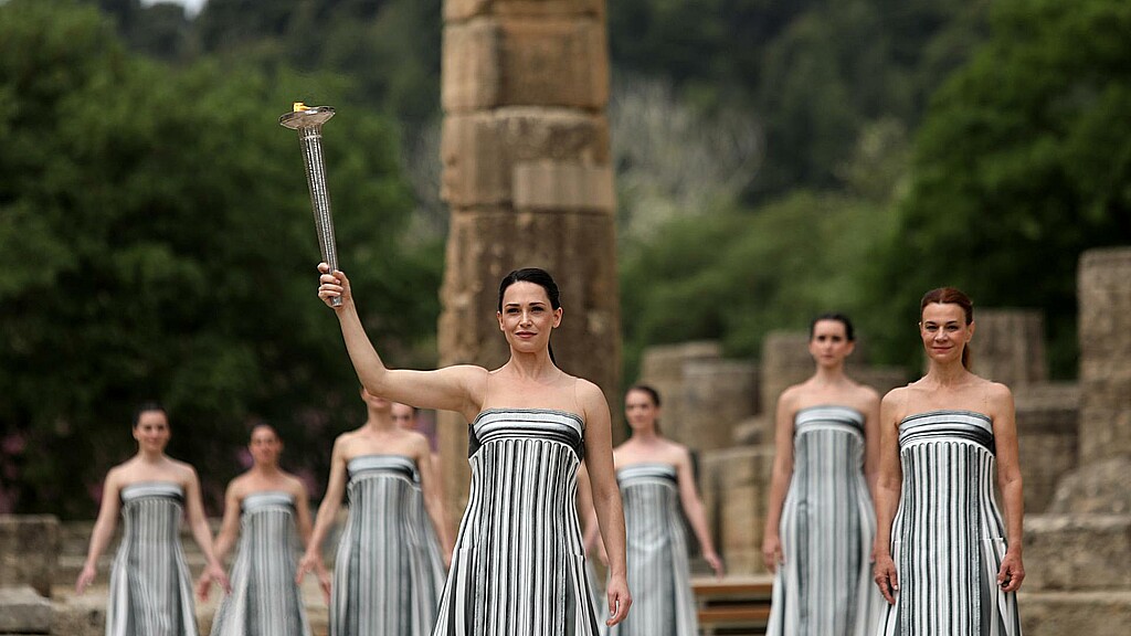 El encendido de la antorcha olímpica se celebró este martes en las ruinas de la antigua Olimpia, en una ceremonia tradicional en la que se invocó al dios Apolo y donde se entregó la llama al primer portador, que comienza su recorrido hacia París para los juegos de este verano.