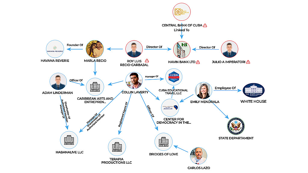 Sin embargo, los lazos del Sr. Laverty con un directivo del banco de Cuba, Havin Bank, sitúan a su organización a solo dos pasos de una entidad cubana bajo sanciones. En 2018, Collin Laverty junto a Marla Leyanet Recio-Carbajal registraron la Caribbean Arts and Entrepreneurship Corp, según datos del record de propiedad de Florida. La dirección de la compañía está listada como 79 SW 12th St. 3207, Miami, FL 33130.