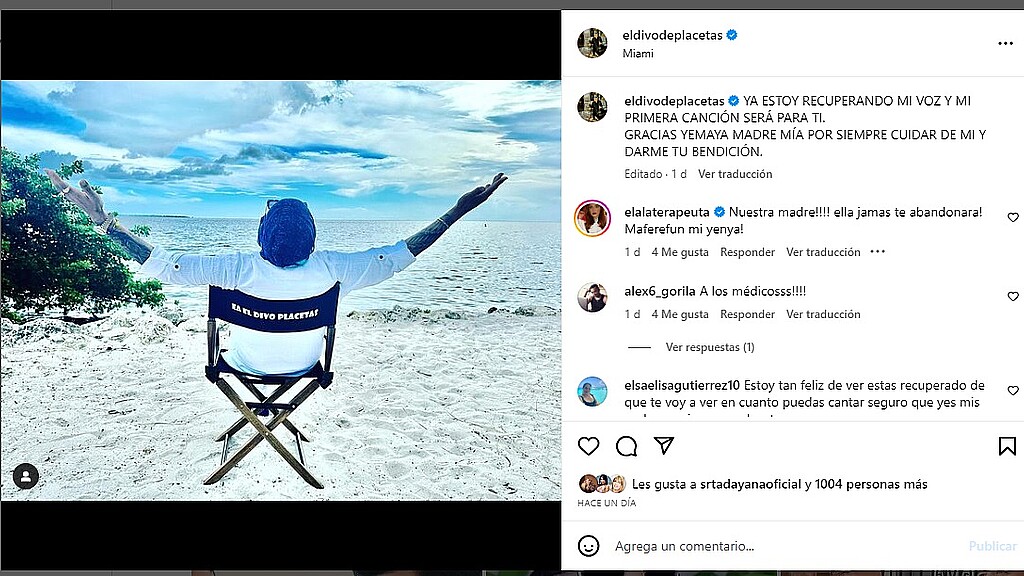“Ya estoy recuperando mi voz y mi primera canción será para ti. Gracias Yemayá madre mía por siempre cuidar de mí y darme tu bendición.”, escribió el artista junto a una foto donde se deja ver sentado frente al mar. Con las manos extendidas al aire, el Divo dedicó su mensaje de Instagram a la diosa orisha, reina de los siete mares y madre de todos los seres vivos según el Panteón Yoruba.