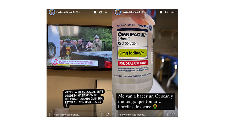 Una hora más tarde, Myrka compartió, también por medio de sus historias de Instagram, que le iban a realizar un escáner CT, el cual se emplea para diagnosticar diferentes enfermedades y la causa de muchos dolores, por lo que debía tomarse dos botellas de una solución oral.