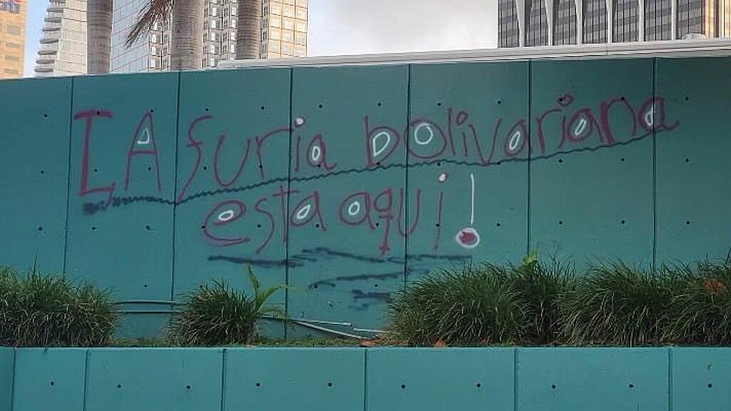 Autoridades de Miami, junto a la agencia Bayfront Park Management Trust, ofrecieron una recompensa de 25.000 dólares por información que conduzca a la captura de los autores de un grafiti con un mensaje que dice: “La furia bolivariana está aquí”, en una de las paredes del parque Bayfront.