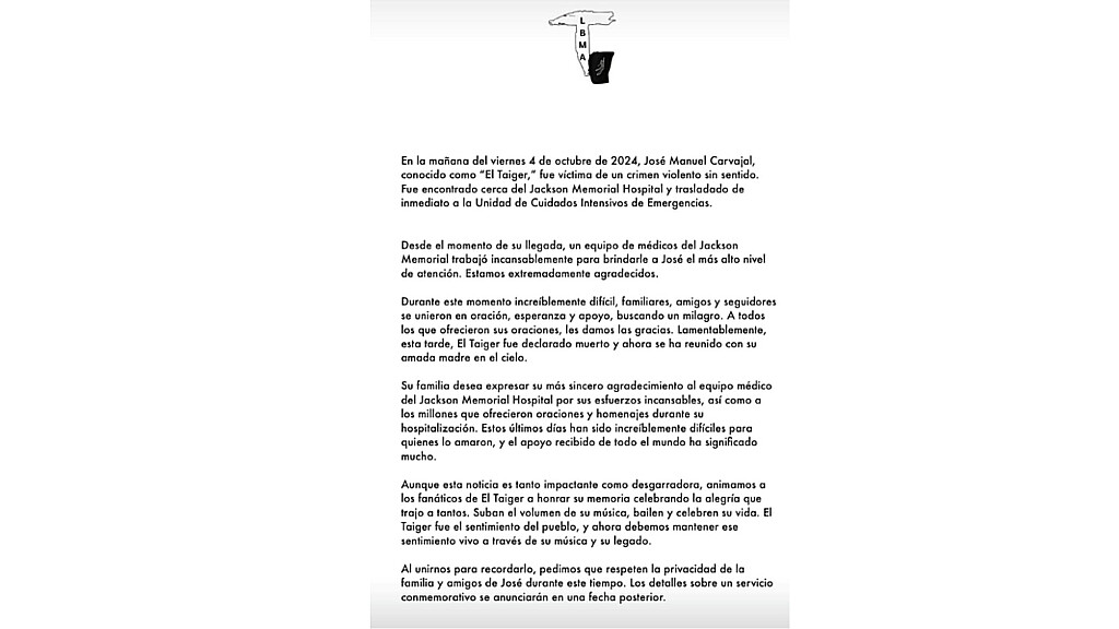 Este jueves 10 de octubre falleció José Manuel Carbajal, más conocido como El Taiger. El reguetonero cubano recibió un disparo de bala en la cabeza y se encontraba luchando por su vida en un hospital de Estados Unidos.