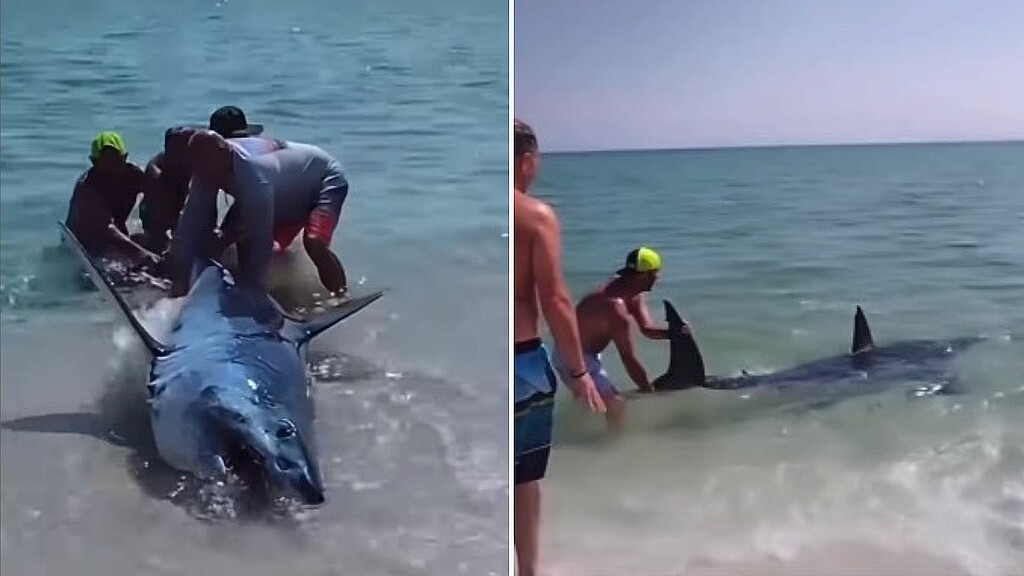 VIDEO: Bañistas rescatan a enorme tiburón varado en las costas de Florida