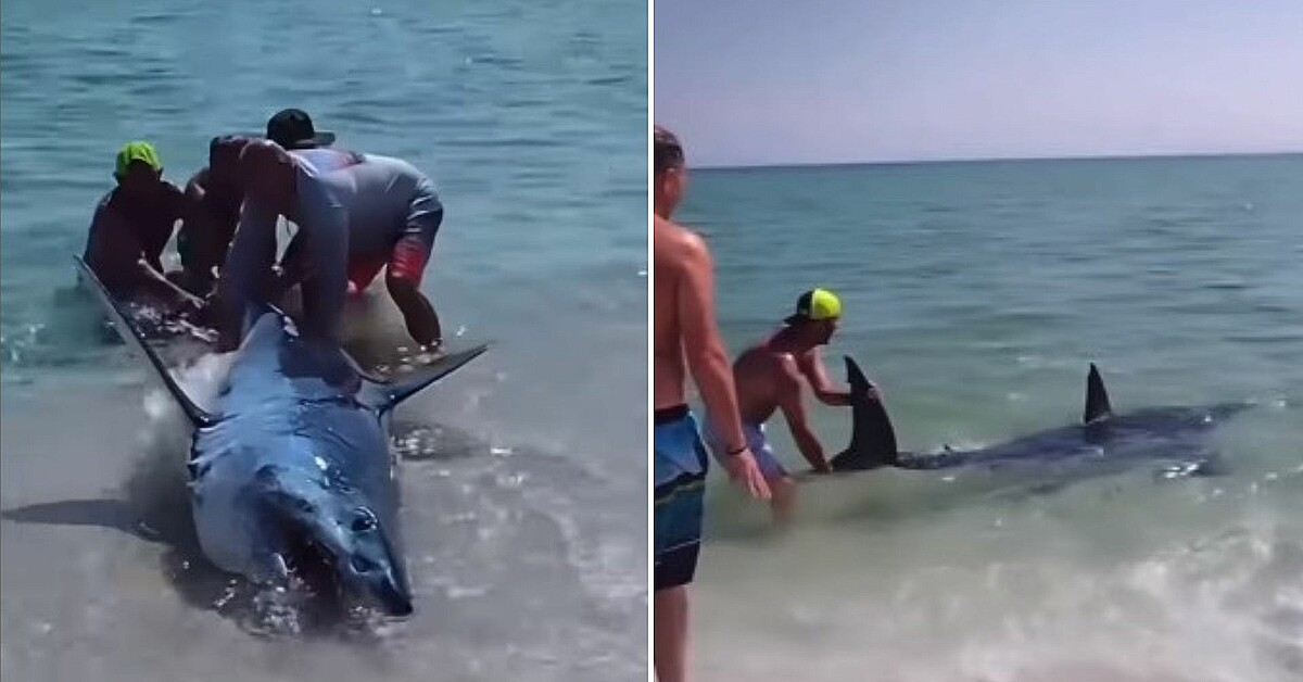 Un video que se volvió viral la semana pasada en redes sociales muestra el momento en que un grupo de bañistas de Florida salva a un enorme tiburón varado y lo devuelve a las aguas costeras.