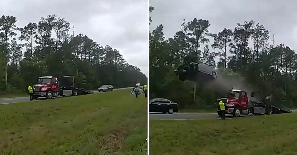 A SCARY SIGHT 😳 Jaw-dropping video shows moment Florida driver ramps tow truck, sending car airborne.