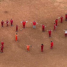 Al menos 31 hombres formaron este lunes las letras en el patio de tierra del centro de detención de Bluebonnet, en la ciudad de Anson