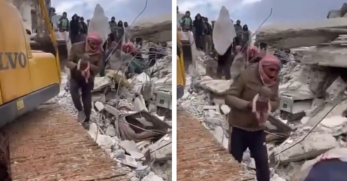Un video que circula por las plataformas digitales logra captar el momento en que uno de varios rescatistas salió corriendo del devastado edificio de cuatro pisos, llevando al pequeño bebé cubierto de polvo a un lugar seguro. El hombre salió con el recién nacido a través de una masa de metal retorcido, concreto roto y alambre de púas, intentando salvar la criatura.