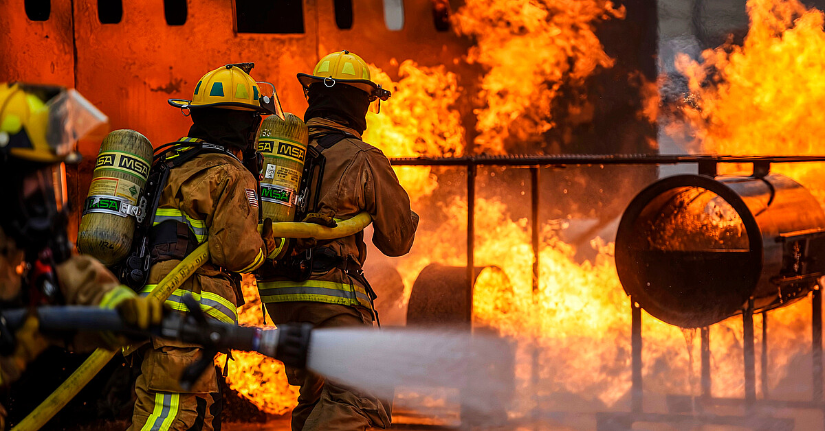 Las imágenes grabadas por transeúntes muestran a los bomberos fuera del edificio siendo derribados y envueltos en una nube de ceniza, y luego agitándose para recuperar el control de las mangueras de pulverización.