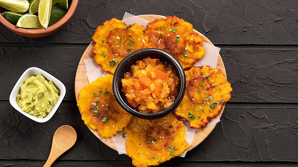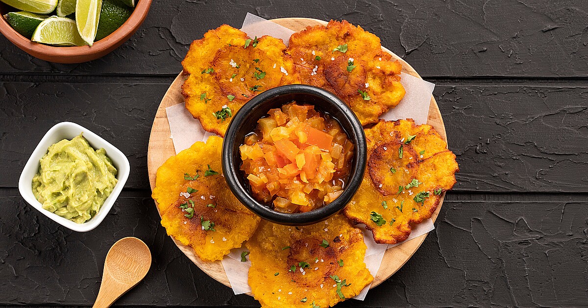 Los patacones con hogao son los aperitivos más aclamados de la gastronomía típica colombiana. Se trata de un pasabocas compuesto por plátanos verdes con una salsa típica del país sudamericano por encima que es muy fácil de preparar.