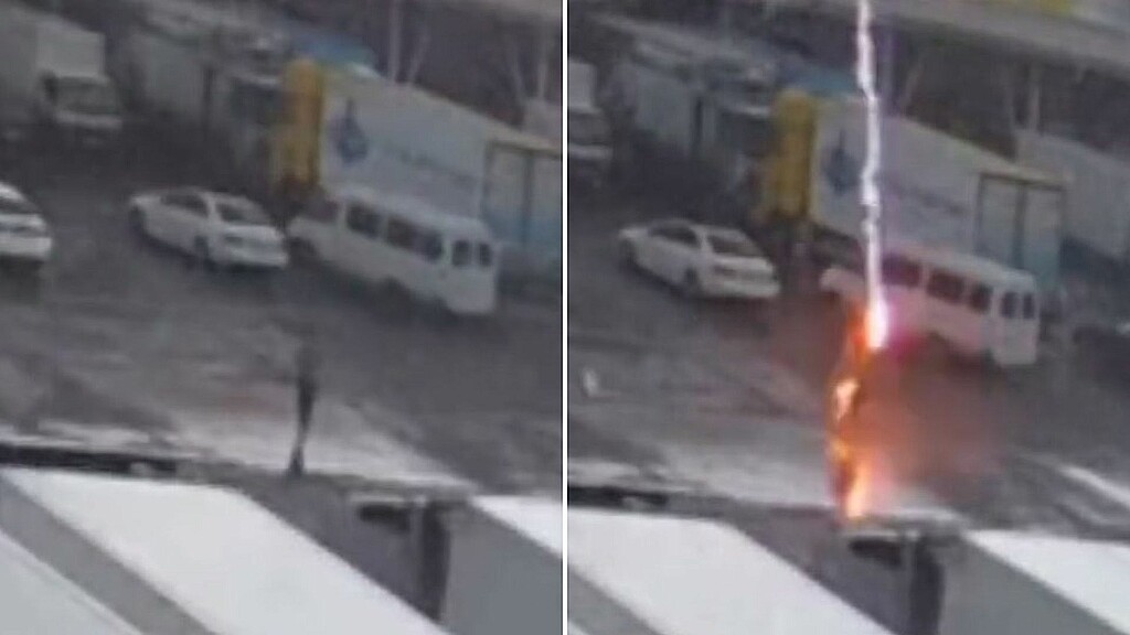 Un video de una cámara de seguridad que se volvió viral en redes sociales muestra a un sujeto caminando al lado de varios vehículos de transporte, cuando repentinamente un potente rayo le cae directamente en la cabeza.