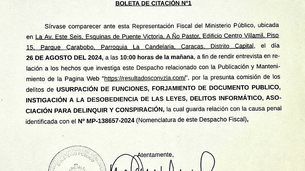 "Sírvase comparecer ante esta representación fiscal del Ministerio Público (...) el día 26 de agosto de 2024 a las 10:00 horas de la mañana, a fin de rendir entrevista en relación a los hechos que investiga este despacho relacionado con la publicación y mantenimiento de la página web https://resultadosconvzla.com", reza la citación.
